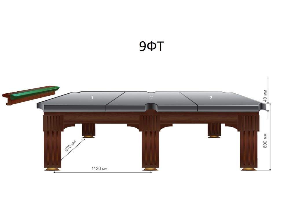 | Размер игрового поля 9-ти футового стола: 2,54х1,27 м. Бильярдная комната должна быть не меньше 6,04х4,77 м. | |||||