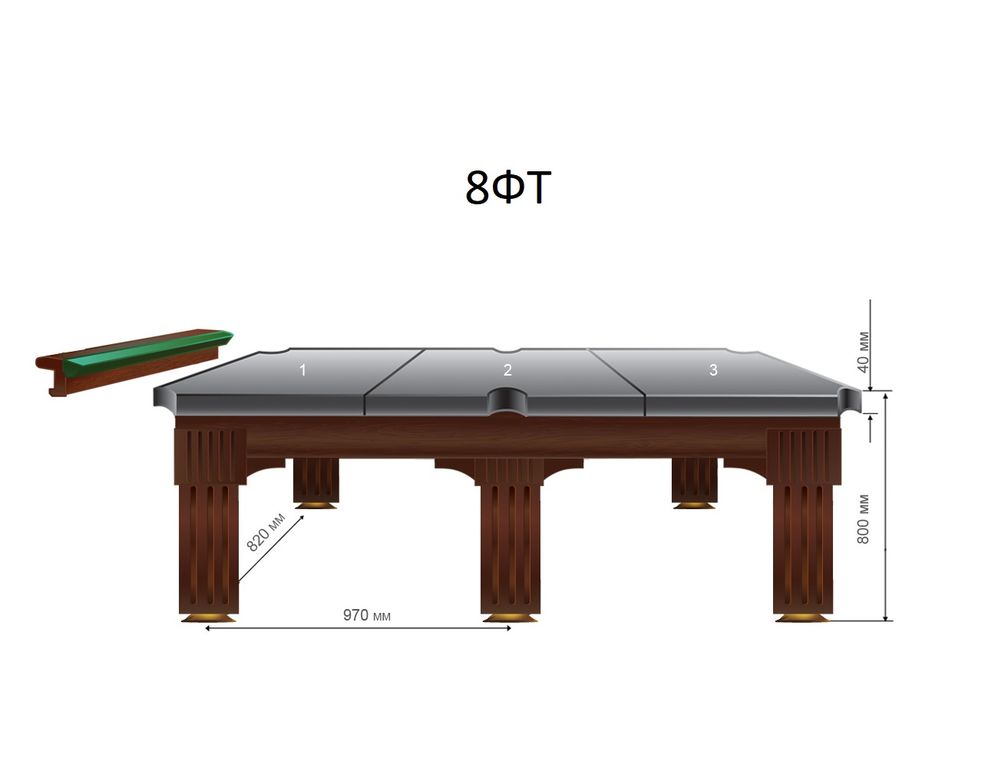 | Размер игрового поля 8-и футового стола: 2,24х1,12 м. Бильярдная комната должна быть не меньше 5,74х4,62 м. | |||||