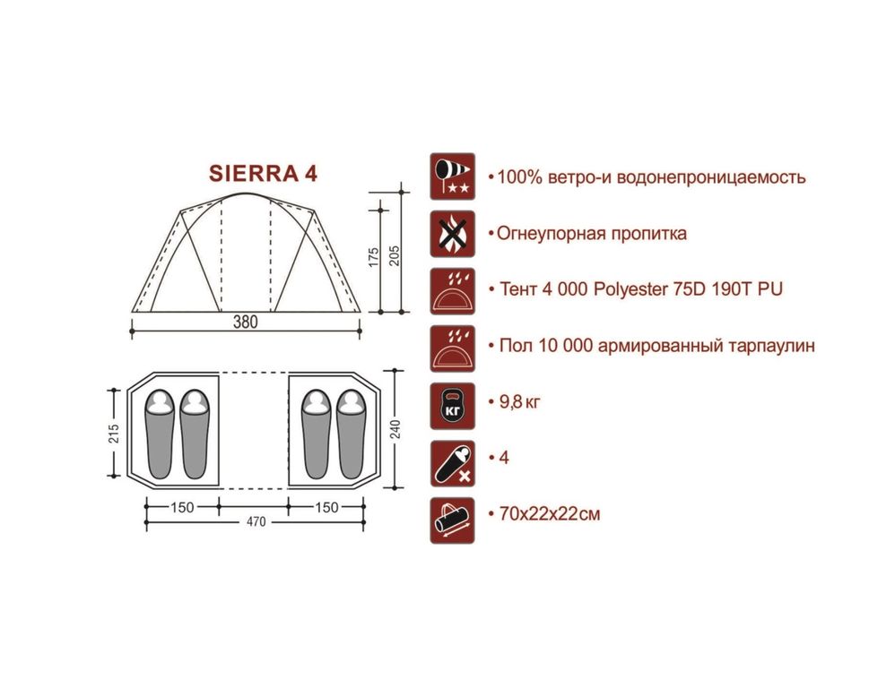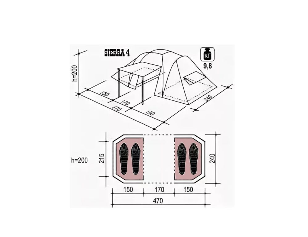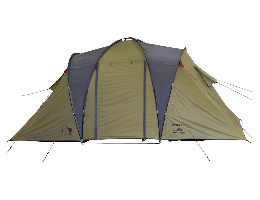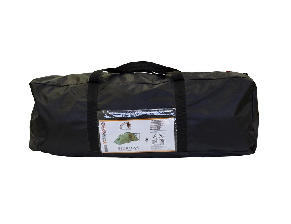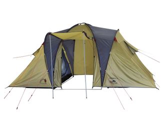 Кемпинговая четырехместная палатка с двумя спальнями и большим тамбуром посередине. Конструкция подвесных спален позволяет, при необходимости, одну или сразу две спальни снять и организовать обширный зал для большой компании. Для своих размеров, палатка обладает хорошей ветроустойчивостью.