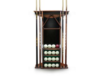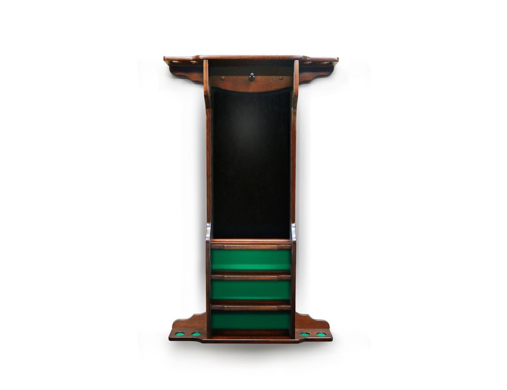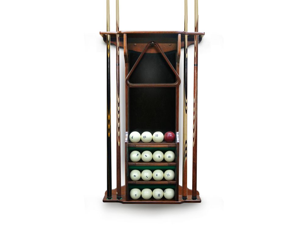 Модель настенная, предназначена для 4 киев, позволяет разместить треугольник, мелки, а также бильярдные шары. Материал сосна или массив ясеня. Стандартная комплектация сукном цвета Yellow green. Есть возможность выбрать цвет.