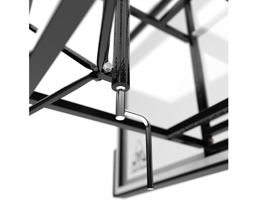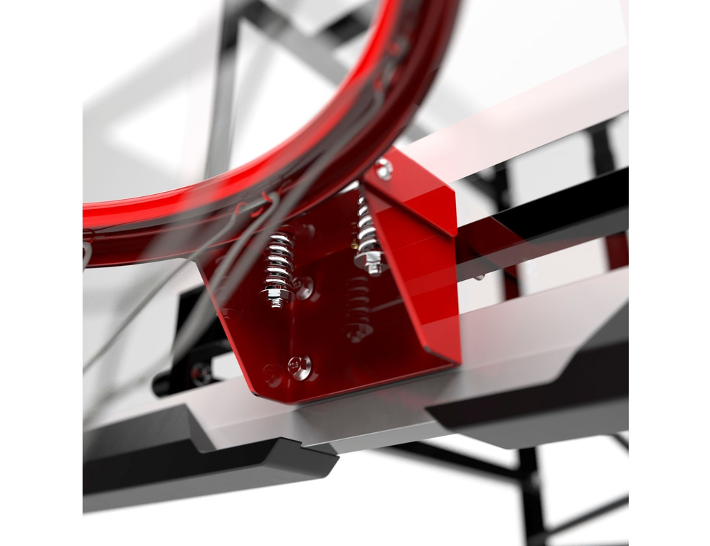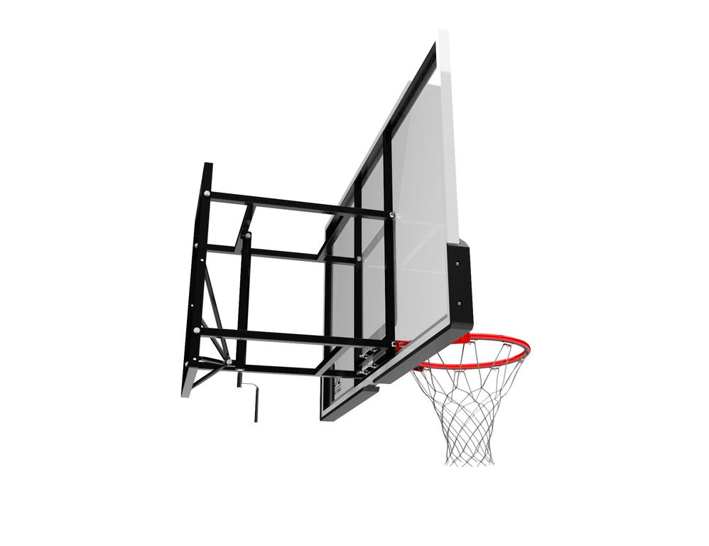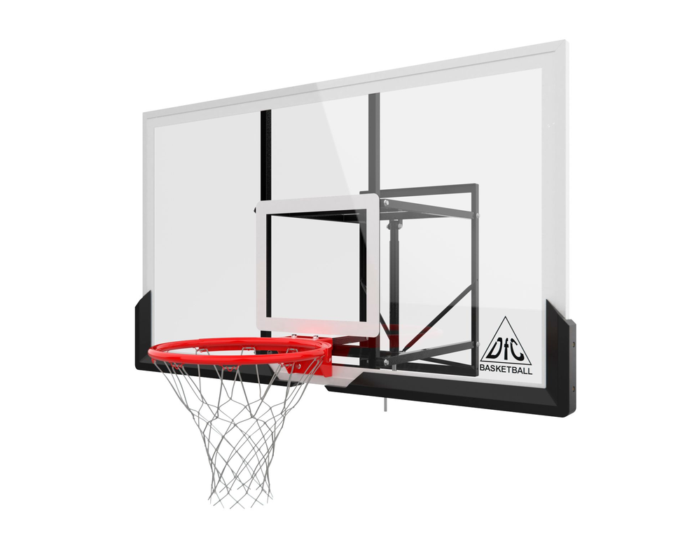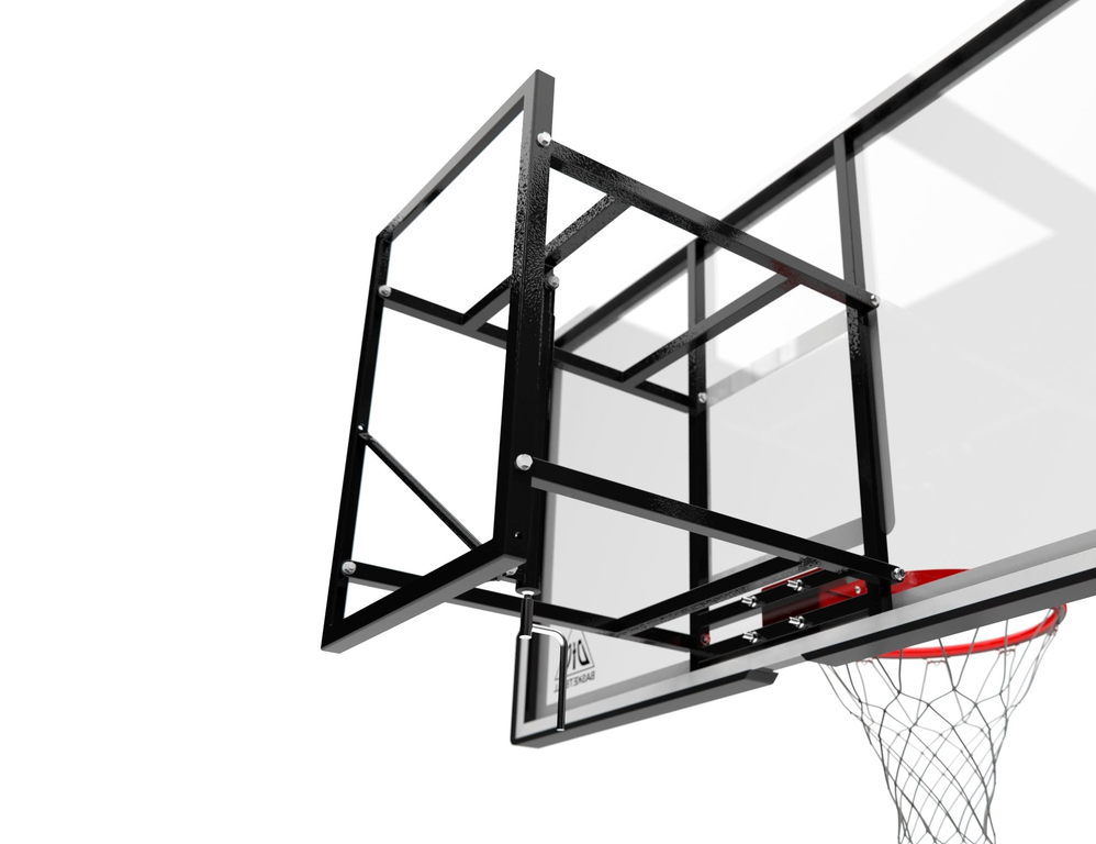 В комплекте идёт крепление к стене, которое позволяет регулировать щит в диапазоне до 75 см по высоте. Регулировка осуществляется с помощью телескопической ручки. Комплектуется кольцом 45 см DFC R3 с амортизацией. В целях безопасности запрещается висеть на кольце и других элементах баскетбольного щита.