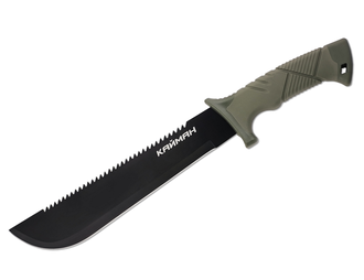 Мачете туристический Ножемир Рубака Кайман T145 KA классическая версия туристической модели. Выполнен на основе маркировочной марки стали 440. Обратная сторона лезвия мачете снабжена мини-пилкой, что позволит расширить функционал изделия. Товар предназначается для решения различных типов бытовых и хозяйственных задач, как на кемпинге, так и в условиях дома-дачи. В комплекте идут защитные ножны из кордуры от грязи и влаги.