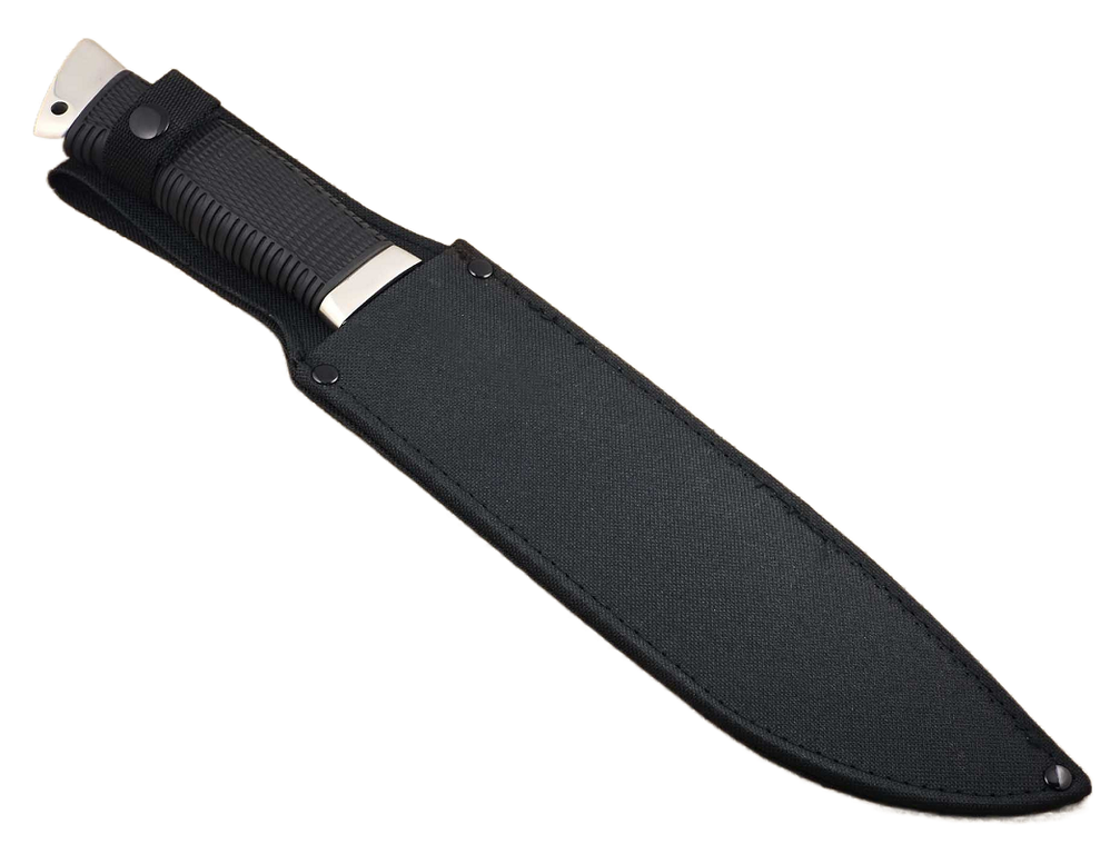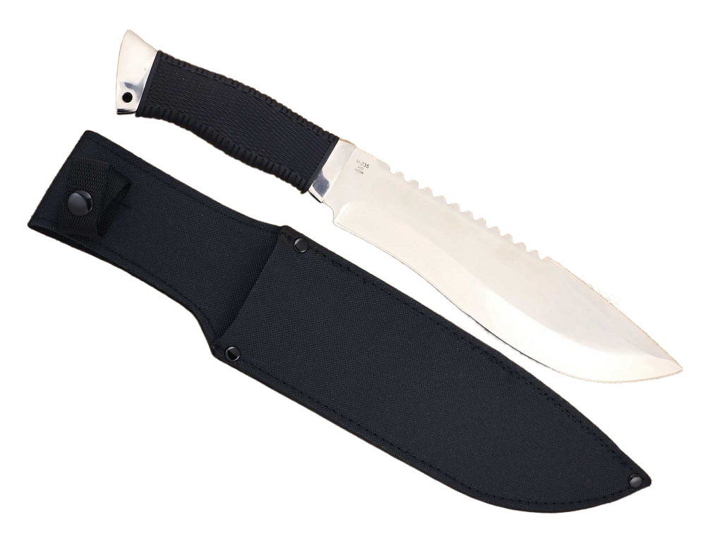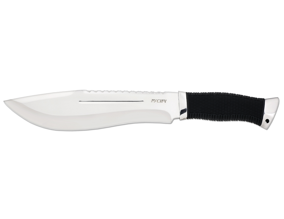 Мачете туристический Ножемир Русич H-235 крупный тесак в стиле кукри. Массивное лезвие из нержавеющей ножевой стали отполировано до зеркального блеска. Листовидное расширение в середине клинка способствует нанесению сильных рубящих ударов. Острый функциональный кончик усилен ребром жёсткости, образованным разнонаправленными фальшлезвием и спусками. Рукоять эргономичной формы расширяется к тыльнику, образуя удобный задний упор. Её поверхность отделена рельефной резиновой накладкой, исключающей скольжение как в перчатке, так и в голой ладони. Рукоять можно разобрать - на тыльнике предусмотрен винт, также служащий для укрепления хвостовика лезвия при возникновении люфта. Ножны из нейлонового полотна защищают клинок от грязи и влаги.