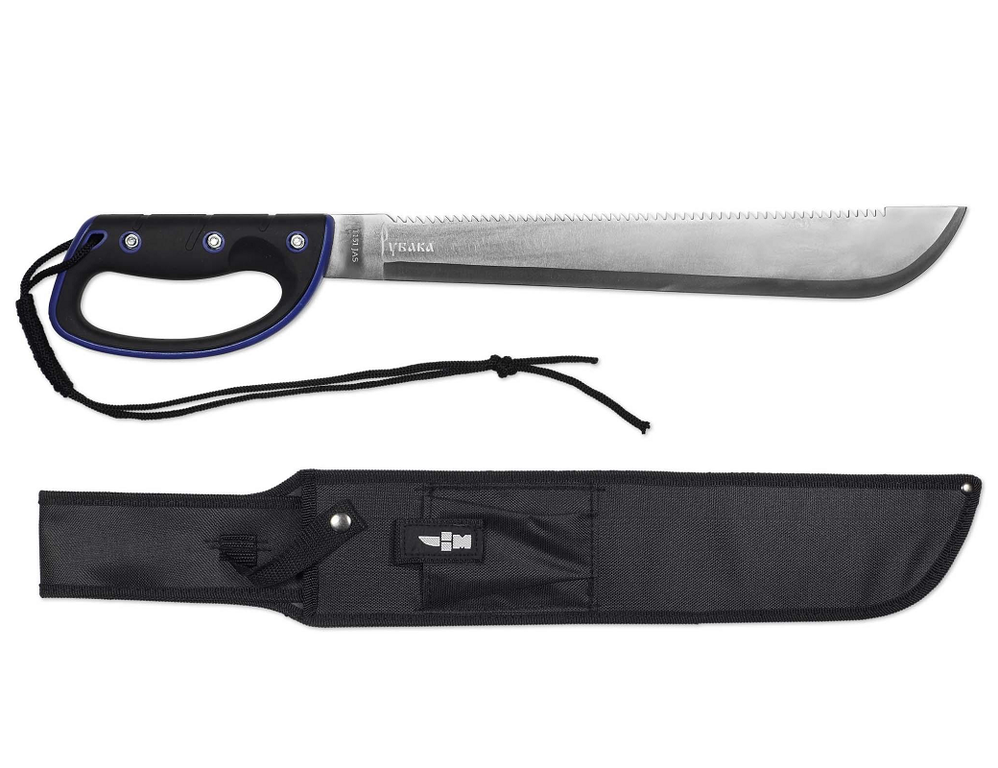 Мачете туристический Ножемир Рубака Jason 13 T151 JAS со слегка расширенным к кончику лезвием, имеет прямой обух и изогнутый режущий край с крутым подъёмом. Такая форма обеспечивает нанесение точных и сильных рубящих ударов. Сталь, использованная при изготовлении этой модели, легирована хромом, который даёт клинку дополнительные антикоррозийные свойства. Удобная хваткая рукоять из пластмассы дополнена резиновыми вставками для лучшего сцепления с ладонью. Это мачете оборудовано темляком для ношения на запястье и ножнами с глухим подвесом на пояс.