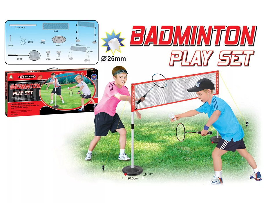 Комплект Альфа Каприз G2015232 для игры в бадминтон. Взрослые и дети смогут сразиться в бадминтон, теперь для этого не нужна специальная площадка - в набор включено всё необходимое для игры. Изготовленные из пластика стойки устанавливаются на специальные базы, снабженные отверстиями с плотно закручивающимися крышками. Базу можно наполнить песком или водой – это повысит общую устойчивость конструкции и избавит от необходимости её дополнительного укрепления. В комплект входят колышки, с помощью которых вы можете регулировать степень натяжения сетки.