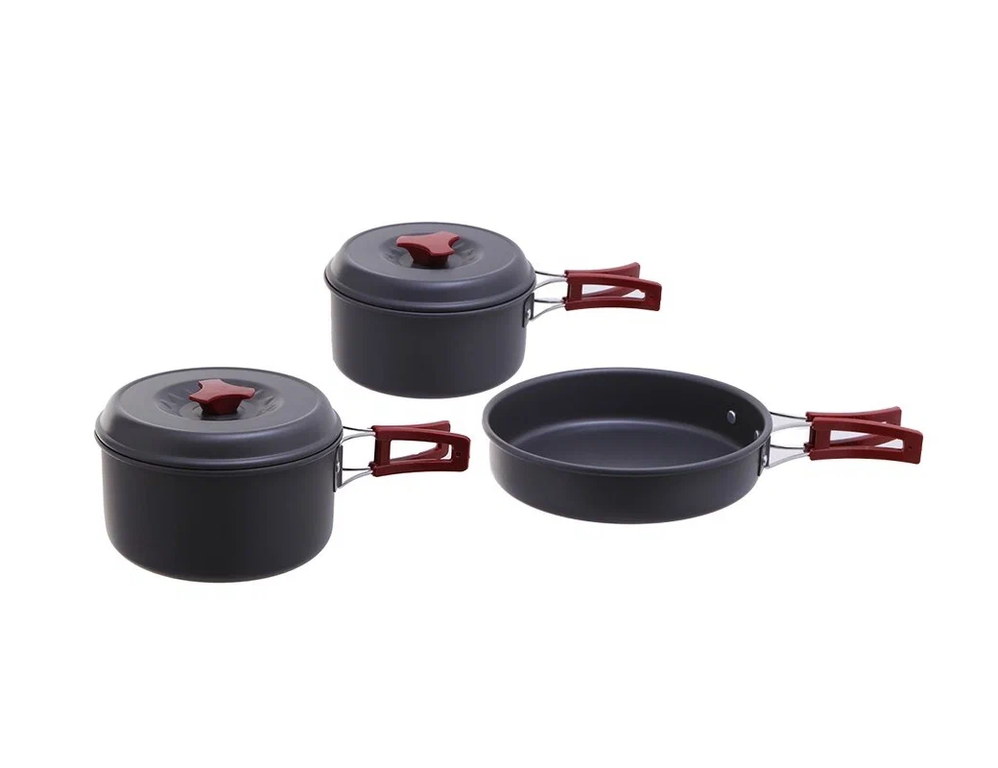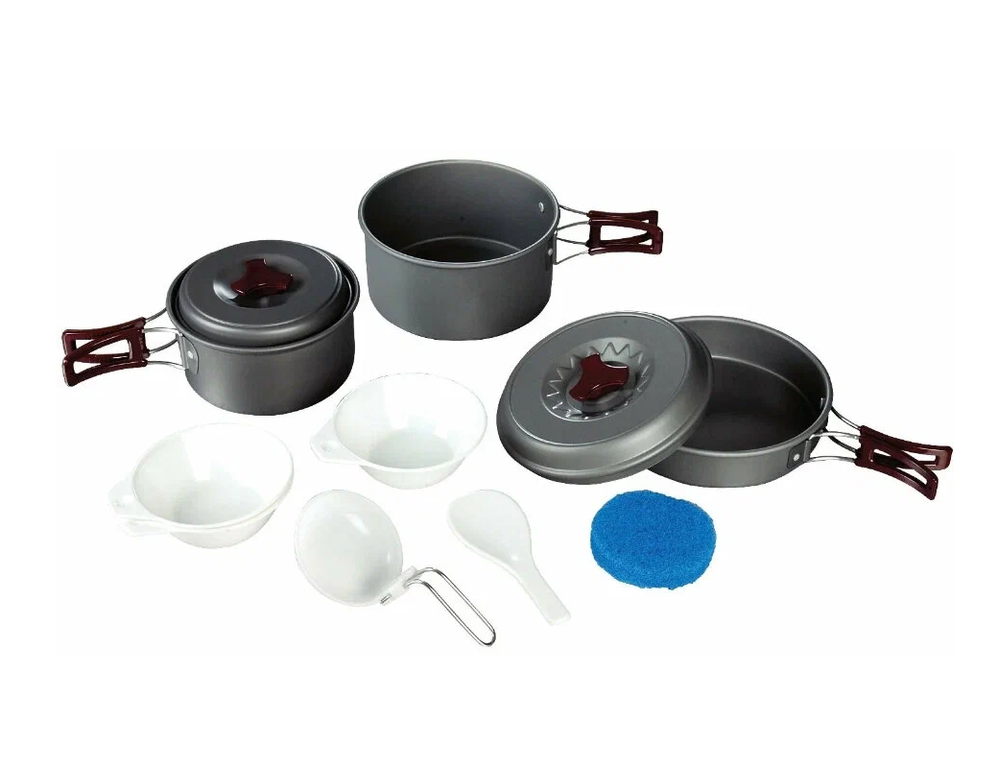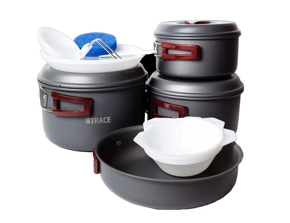 Комплект: котелок 1,8 л., котелок 1л., сковорода 177 мм, ложка суповая, поварешка, тарелки глубокие 3 шт., губка