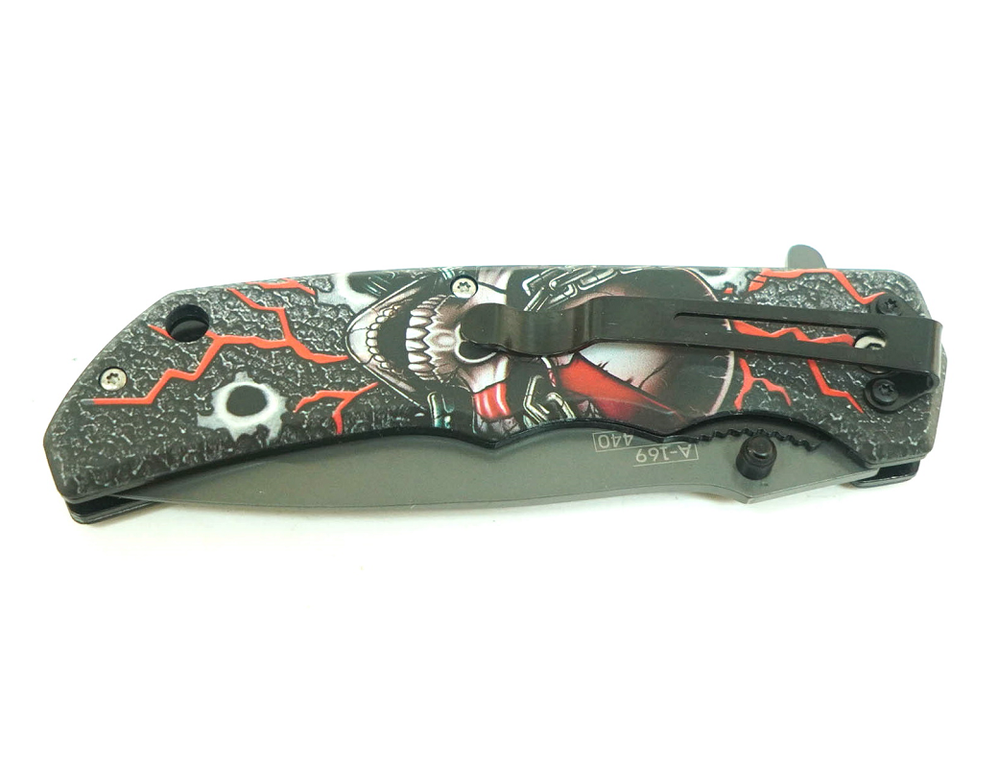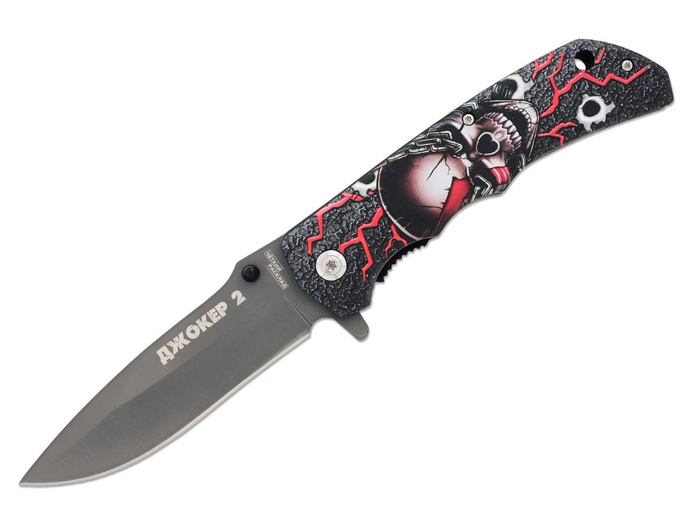 Нож полуавтоматический Ножемир "Чёткий расклад" Джокер 2 (A-169) инструмент в стильном исполнении. Клинок ножа имеет универсальную конфигурацию "drop-point", что позволяет использовать его с одинаковой эффективностью и для реза, и для прокола отверстий. Длина клинка 10 см, он изготовлен из антикоррозийной стали 440, и закалён до показателя 55-56 hrc. Рукоятка металлическая, украшена стилизованным рисунком. Рисунок на поверхность металла нанесён по специальной технологии, обеспечивающей сохранение внешнего вида на длительный период. Механизм открывания ножа "liner lock", для выброса лезвия необходимо нажать на плавник. Инструмент имеет отверстие для установки страховочного шнура.