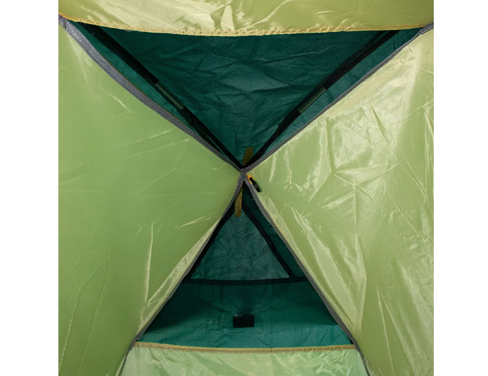 Палатка туристическая, бюджетная трекинговая двухслойная с лёгким и быстрым способом сборки и установки. Модель имеет небольшой тамбур, а также два вентиляционных клапана. Внутренний слой изготовлен из "дышащего полиэстера", благодаря чему в палатке сохраняется комфортный температурный режим. Для защиты от насекомых на входе предусмотрена противомоскитная сетка. Места крепления оттяжек имеют усиление, а верёвки оттяжек сделаны из паракордового шнура со светоотражающей нитью.