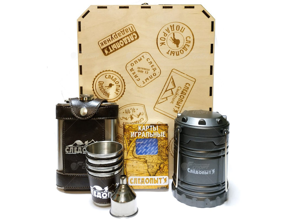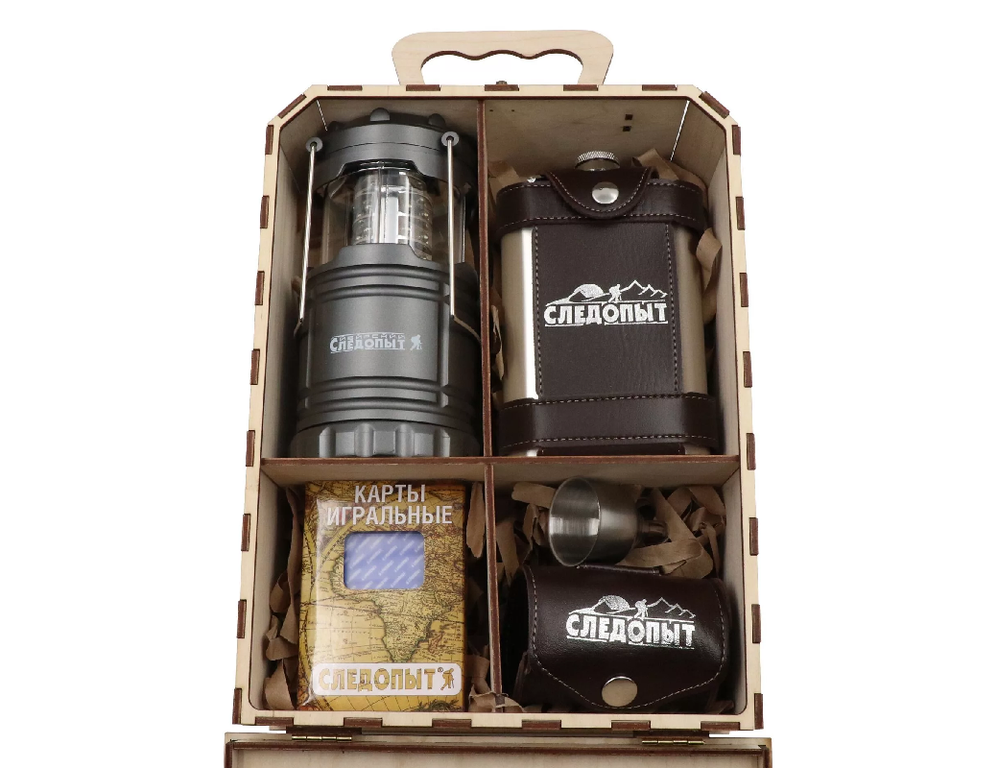 Комплект состоит: фирменные кемпинговый фонарь, набор рюмок, фляжка, воронка для фляжкики, игральные карты