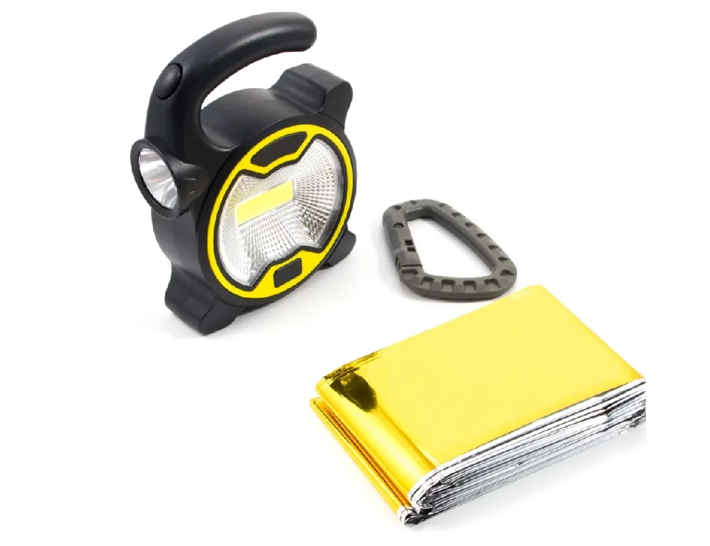 Комплект состоит: фирменные термоодеяло двухстороннее, карабин, фонарь