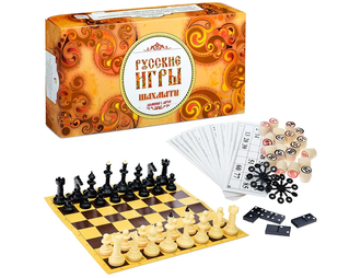 Русские игры: шахматы, лото и домино — захватывающие и доступные игры, в которые с интересом и восторгом играют большинство людей. В красочной коробке со стилизованными русскими узорами. Все игральные фигуры выполнены из пластмассового композита, бочонки из древопласта. Доска для шахмат и шашек изготовлена из качественной микрогофры, поэтому она удобная и лёгкая на вес.