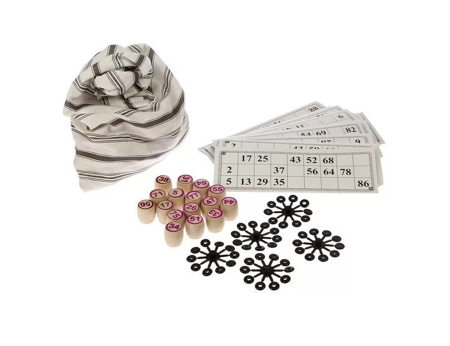 - мешочек, выполненный из практичного материала, для перемешивания и хранения бочонков и 24 карточки для лото