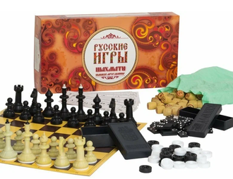 Русские игры: шахматы, шашки, лото и домино — четыре захватывающие и доступные игры, в которые с интересом и восторгом играют большинство людей. Все игральные фигуры выполнены из пластмассового композита, бочонки из древопласта. Доска для шахмат и шашек изготовлена из качественной микрогофры, поэтому она удобная и лёгкая на вес.