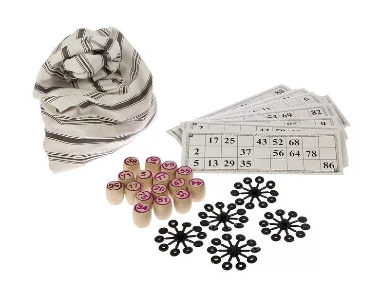 - мешочек, выполненный из практичного материала, для перемешивания и хранения бочонков и 24 карточки для лото