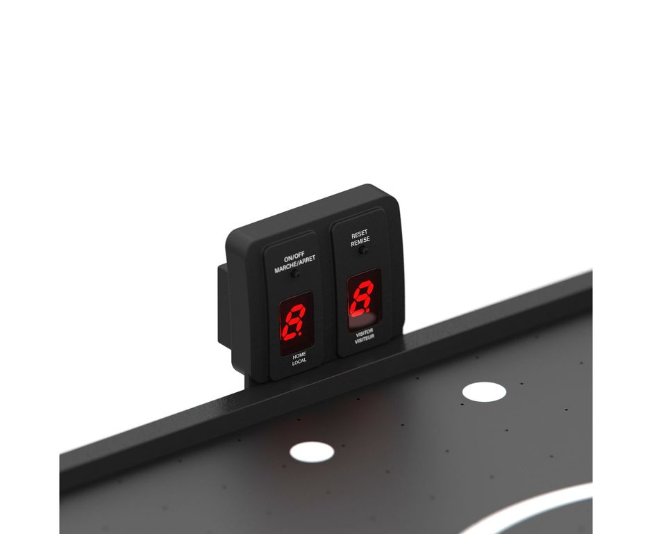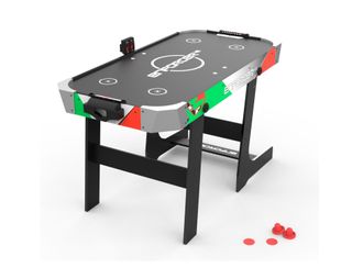 В комплект поставки входят 2 биты и 2 шайбы, а также механические счётчики голов. Стол работает от сети с напряжением 220 вольт. Аэрохоккей легко сложить и откатить в угол комнаты или за диван после игры.