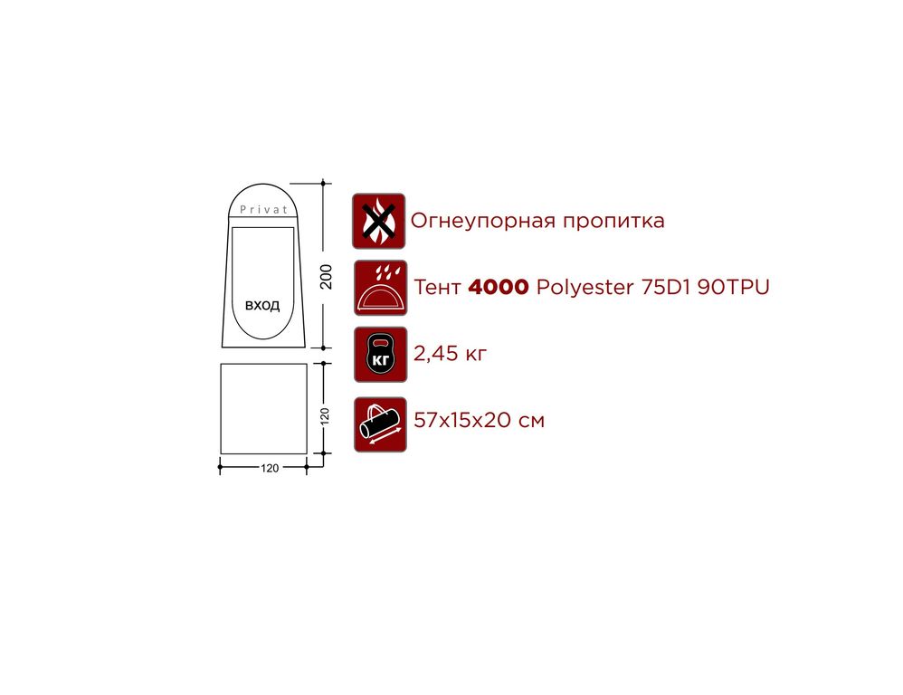 Небольшая портативная палатка-шатер для организации душа или туалета на даче и природе. Водонепроницаемые швы, карман для аксессуаров. Водонепроницаемость тента 4000 мм. Каркас - фибергласс. Огнеупорная пропитка. Вентиляционное окно в крыше.