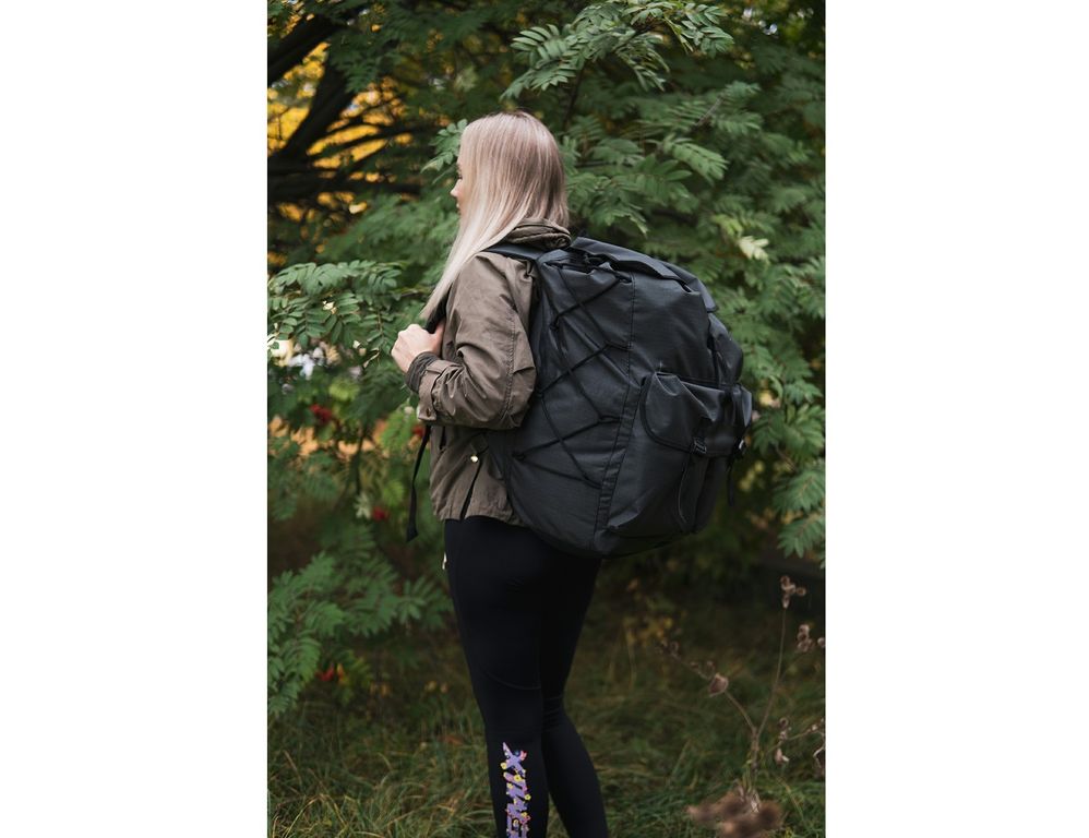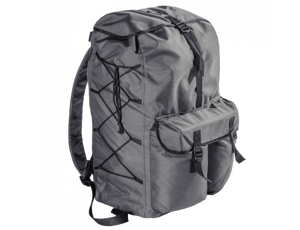 Рюкзак Натуралист 50 серого цвета имеет один внешний карман, бока рюкзаказ дублированы шнуровкой для удобства крепления дополнительного груза или утяжки объема рюкзака.