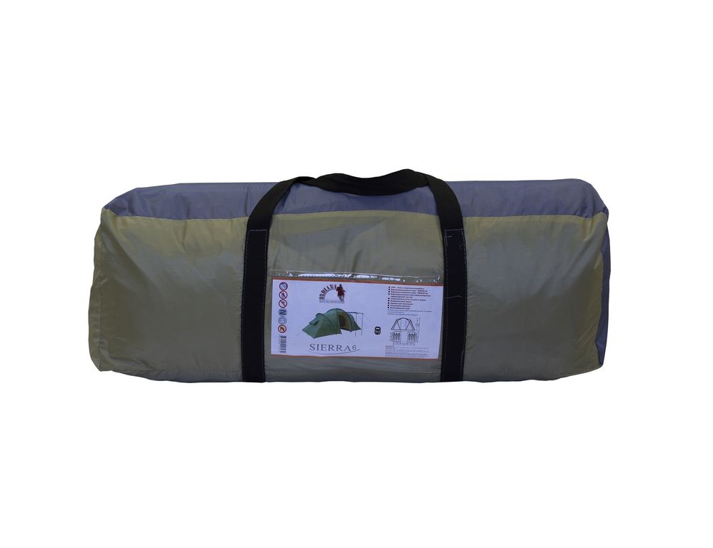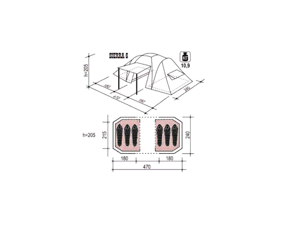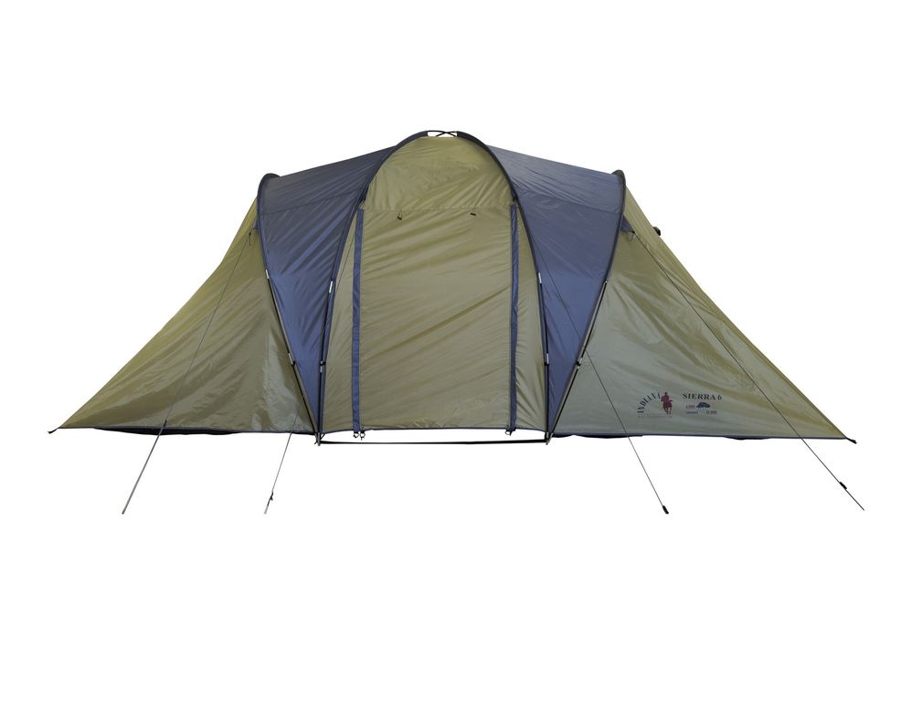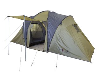 Кемпинговая шестиместная палатка с двумя спальнями и большим тамбуром посередине. Конструкция подвесных спален позволяет, при необходимости, одну или сразу две спальни снять и организовать обширный зал для большой компании. Для своих размеров, палатка обладает хорошей ветроустойчивостью.
