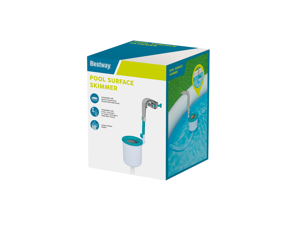 Навесной скиммер от производителя Bestway – один из лучших способов для первичной фильтрации воды, поступающей в фильтрующий насос. Совместим с фильтрующими насосами производительностью от 2006 л/ч и выше. Выполнен исключительно из высококачественного пластика, который значительно продлит эксплуатационный период. Регулируемый кронштейн позволяет зафиксировать скиммер на борту бассейна, что делает его более универсальной моделью. Самостоятельно справляется с удалением с верхней поверхности воды мелкого мусора, стружки и сухих листьев. Простая конструкция не требует профессиональных навыков для установки.