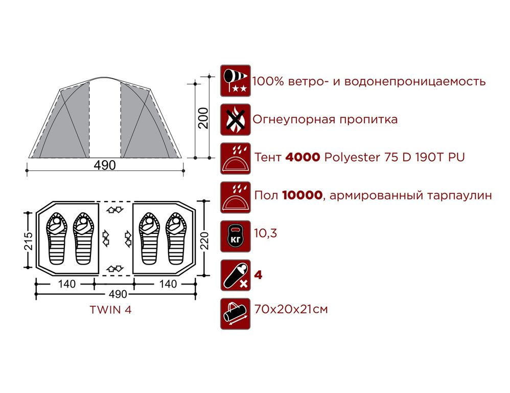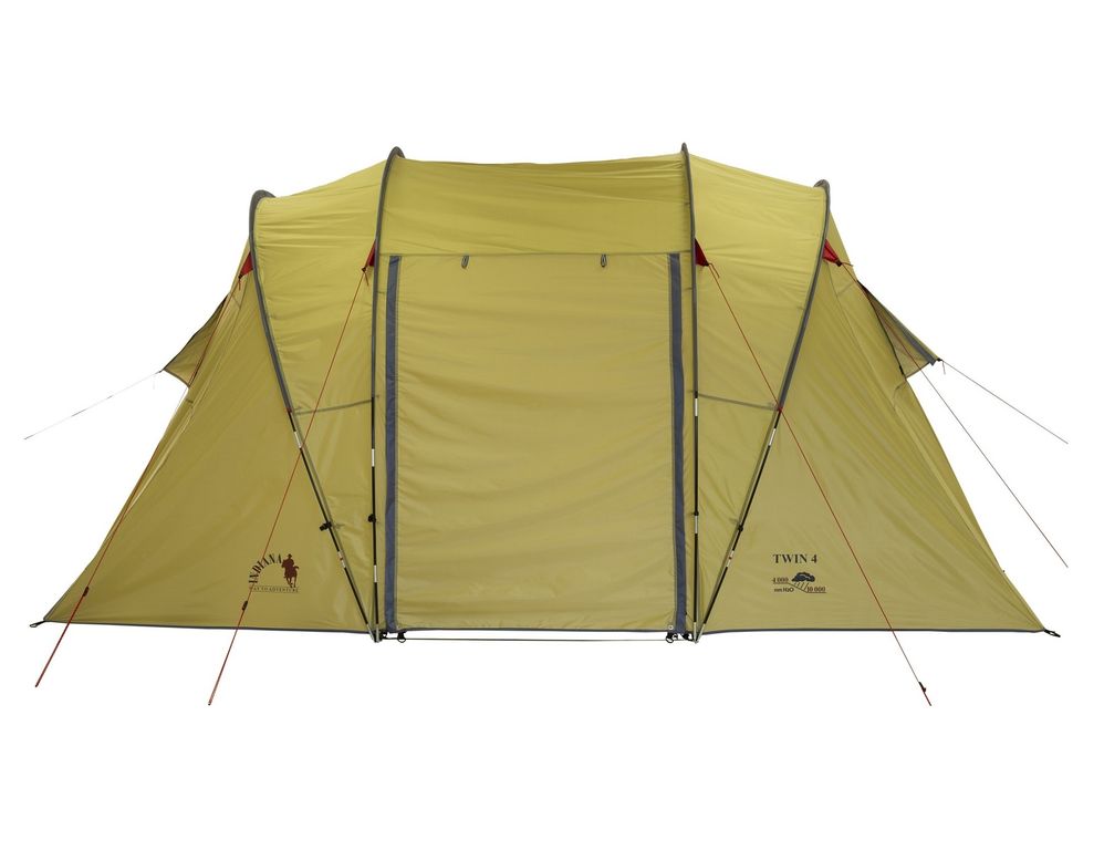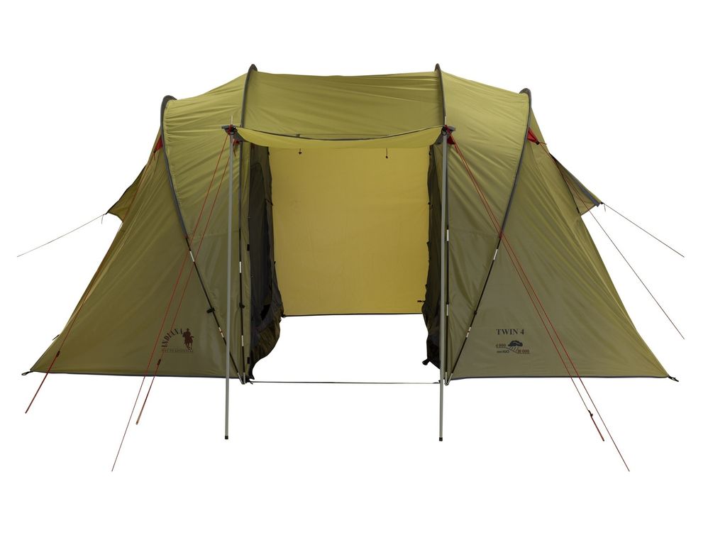 Палатка Indiana Twin 4 рассчитана на удобное размещение 4 взрослых людей. Две раздельные комнаты, в каждой из которых может спать по 2 человека, отделены друг от друга большим тамбуром. Его можно сделать ещё просторнее за счёт открывающихся стенок, из которых собирается навес. У вас будет достаточно места, где можно установить кемпинговую мебель, оборудовать кухню и организовать хранение вещей. Палатка отлично проветривается — все помещения оснащены вентиляционными окнами с защитными козырьками и москитными сетками. Ставится и собирается эта модель буквально за несколько минут.