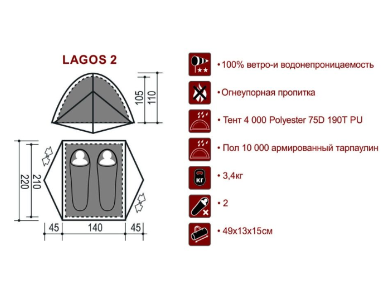 Палатка Indiana Lagos 2 - отличная недорогая модель для начинающих туристов. Наиболее удачное соотношение качества и стоимости гарантируют Вам комфортабельный отдых. Благодаря малому весу чаще всего данную модель приобретают для непродолжительных пеших или велосипедных походов.