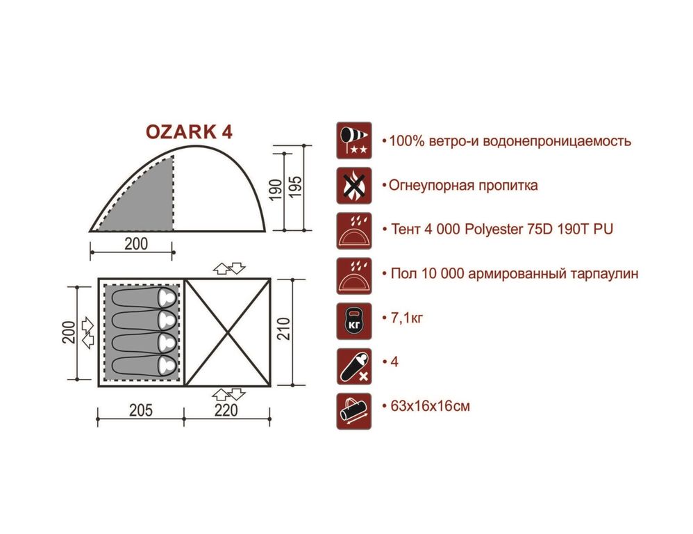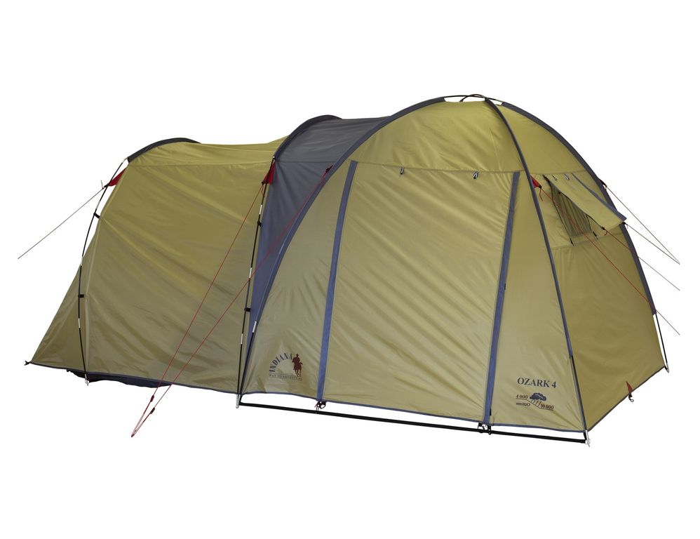 Палатка Indiana OZARK 4 имеет классическую форму и прекрасно подойдет для семейного отдыха на природе: благодаря просторному тамбуру палатка обладает хорошей вентиляцией, также в нем можно комфортно разместить много личных вещей, стол со стульями и походную кухню. В палатке предусмотрен дополнительный вход в спальное отделение. Хорошая ветро- и влагоустойчивость, небольшой вес - гарантия надежности и долговечности, что так немаловажно в длительном кемпинге.