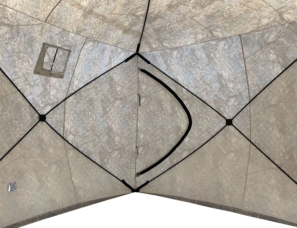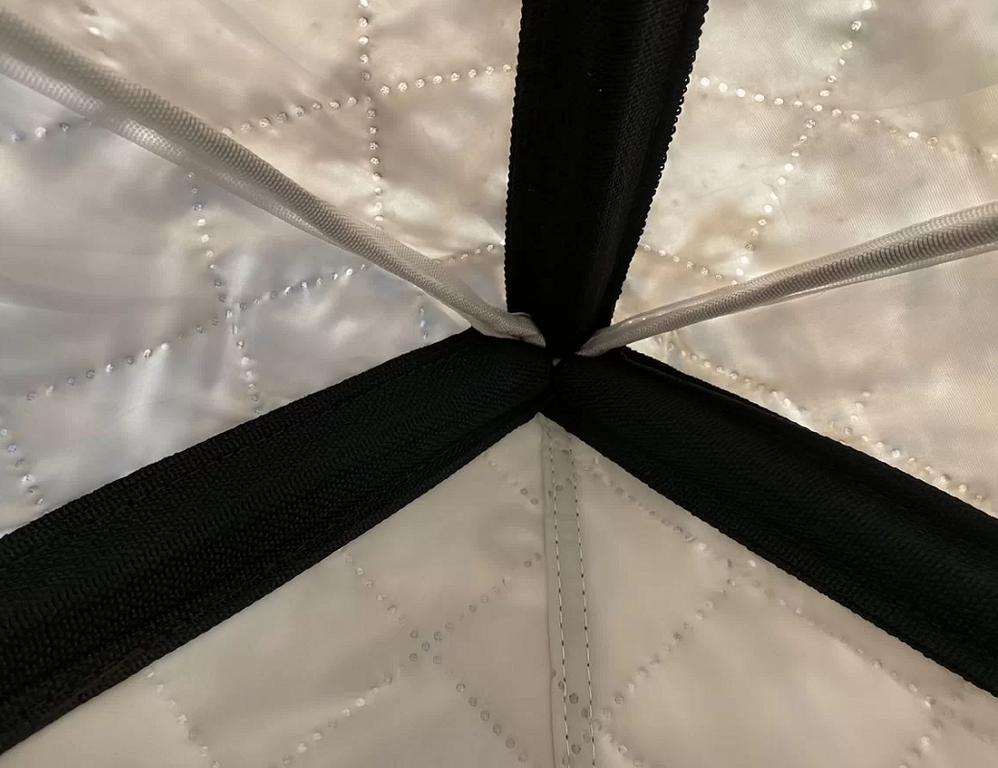 Данная палатка обеспечит комфорт на рыбалке в зимнее время года. Благодаря системе крепления дуг «хабы» палатки очень быстро переводятся из транспортного положения в рабочее состояние. «Хаб» выполнен из морозостойкого, ударопрочного материала – полиамид. Каркас изготовлен из прочного стеклопластикового прутка d=11 мм. В нижней части к палатке пришита внешняя юбка. Внутри палатки предусмотрен карман для хранения рыболовных мелочей. Для хорошего освещения внутреннего пространства в палатку встроены окна, которые выполнены из прозрачной пленки. Также на окнах предусмотрены внешние козырьки для защиты от солнца и снега. Для создания комфортного микроклимата внутри закрытой палатки имеются вытяжной и приточный клапаны. Молнии 2-х входов закрыты внешними клапанами для защиты от снега и ветра.