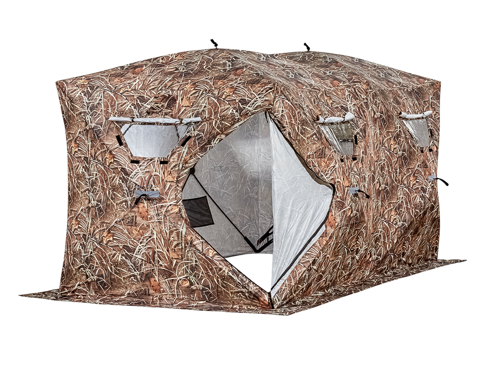 Зимняя палатка Higashi Camo Double Comfort с внешней стороны окрашена в защитный камуфляж "камыш, ветки и листья", изнутри полотно светлое (оборотная сторона принта). Камуфляжный окрас отлично подходит для охоты, чтобы укрыться в лесу или наоборот, чтобы быть заметным на рыбалке на льду (дополнительно снаружи предусмотрены светоотражатели). Модель Хигаши Камо Дабл Комфорт быстро собирается и разбирается благодаря конструкции хабов или другими словами «зонтичной». Размеры палатки 360х180х205 сантиметров. Длина считается по полу, включая ветрозащитные юбки. Высота любой секции 2,05 метра, считается по центральному потолочному хабу. Вместимость 4-6 человек со снаряжением. С учетом печи в палатке будет комфортно и в вечернее время (в зависимости от региона).